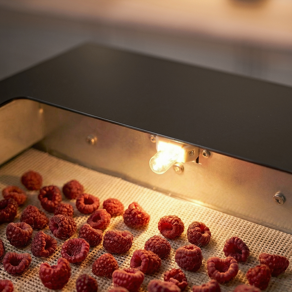 Чёрный корпус из нержавеющей стали, устойчивый к нагреву, влаге и коррозии, выглядит лаконично и современно, легко вписывается в интерьер кухни или мастерской. Внутри установлено 8 поддонов из нержавеющей стали с зазором 25 мм — этого достаточно, чтобы удобно размещать ломтики фруктов, травы или мясные полоски.
