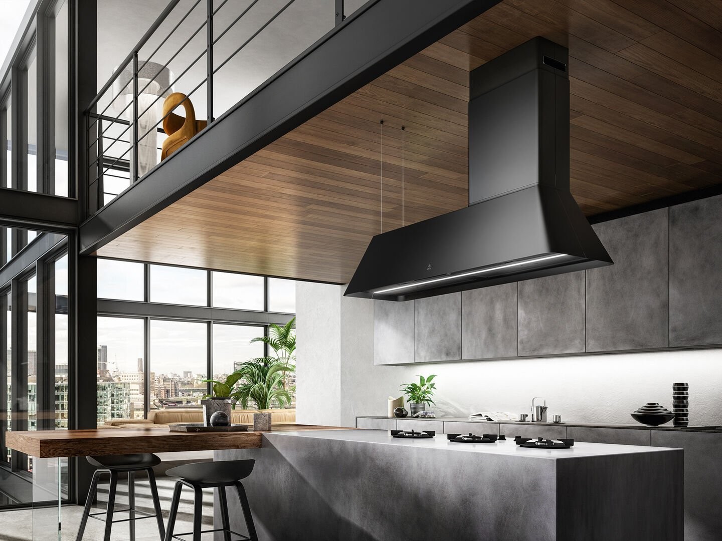 soft touch или с отделкой из нержавеющей стали и предлагает широкий выбор способов установки: отвод воздуха или фильтрация, настенное или подвесное крепление, с вытяжной трубой, которую можно расположить с права или слева, или же без нее.