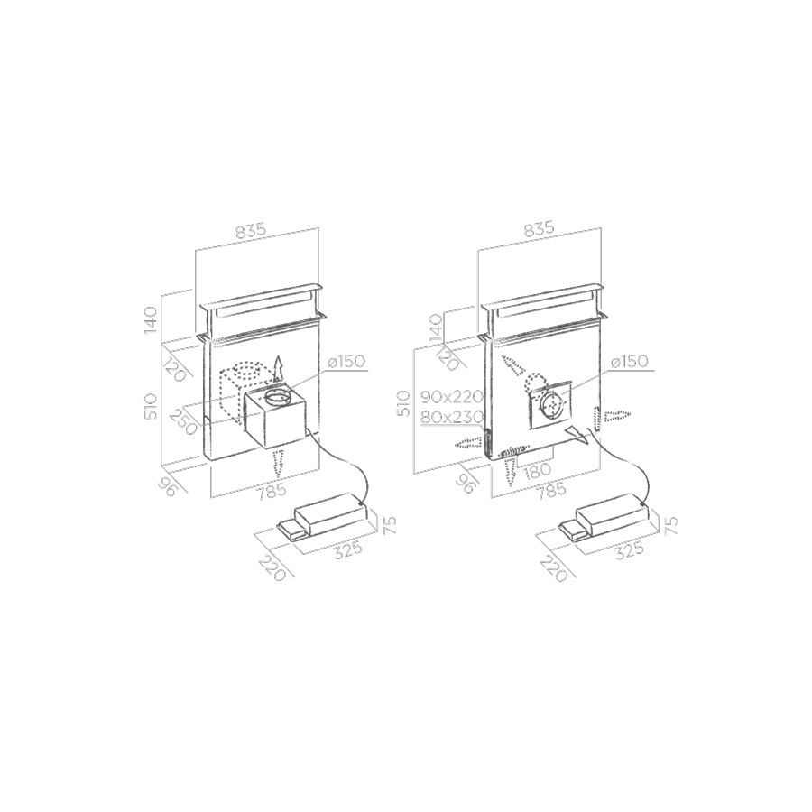 - За счет оптимизации забора воздушного потока вытяжке достаточно выдвигаться всего на 14см над столешницей. Ширина верхней видимой части 83,5см.