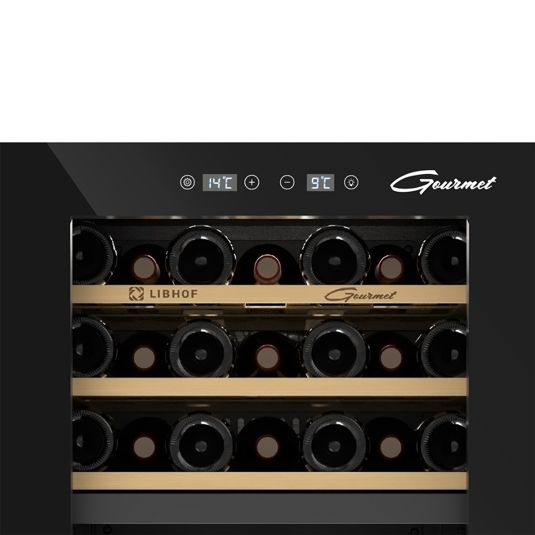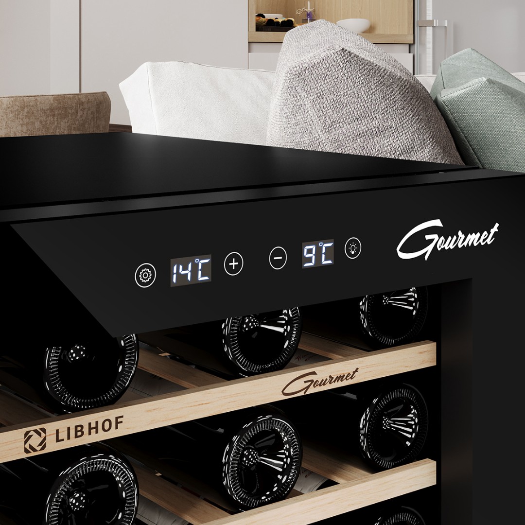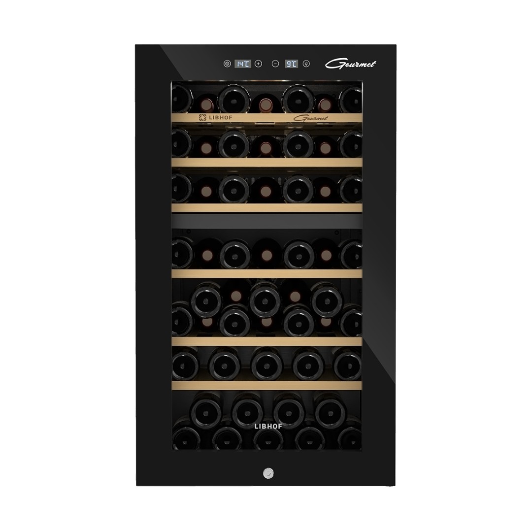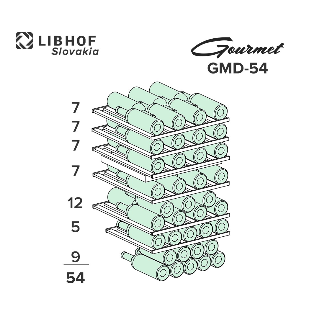 Мультитемпературный винный шкаф Libhof GMD-54 имеет две зоны охлаждения и позволяет регулировать температуру в одной зоне в диапазоне от 5 до 12 °C, во второй зоне от 12 до 20 °C,что делает его подходящим для хранения различных видов вин. Винный холодильник вмещает 54 бутылки типа бордо и имеет 6 съёмных полок из массива дерева. Отдельностоящий винный шкаф, оснащён современной компрессорной системой, которая значительно снижает уровень вибрации и шума, предотвращая взбалтывание вина и появление осадка.