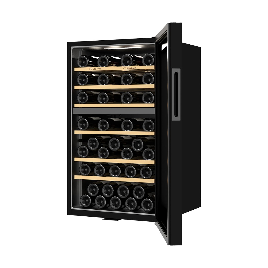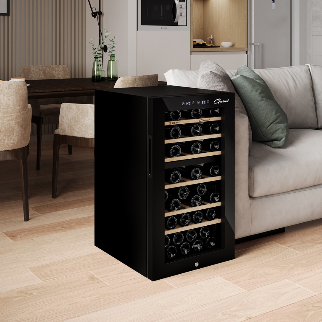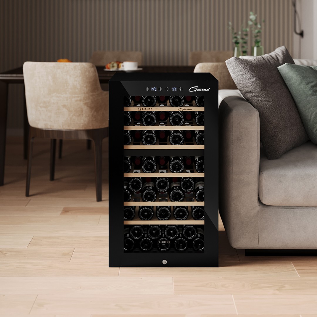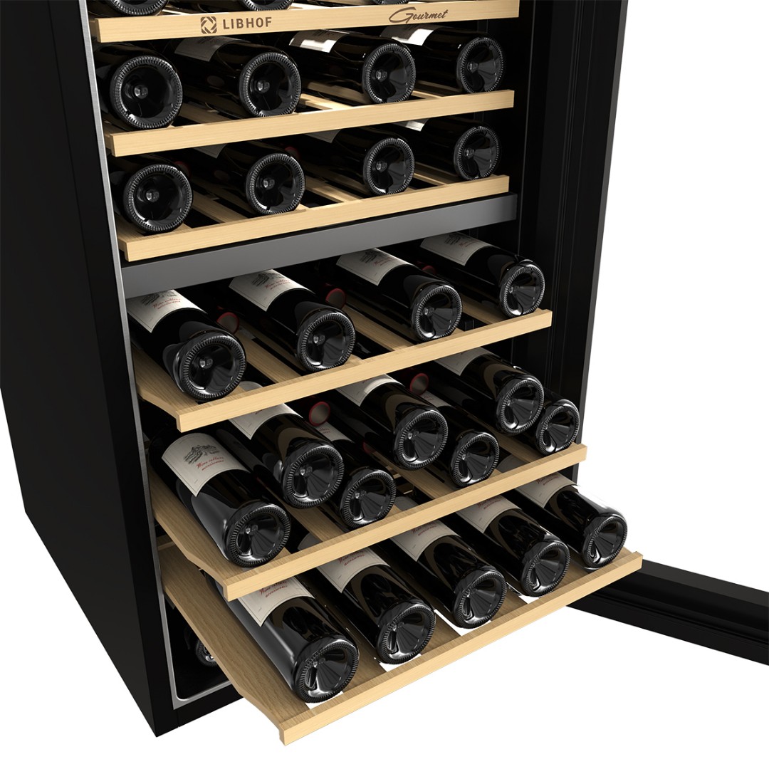 Мультитемпературный винный шкаф Libhof GMD-54 имеет две зоны охлаждения и позволяет регулировать температуру в одной зоне в диапазоне от 5 до 12 °C, во второй зоне от 12 до 20 °C,что делает его подходящим для хранения различных видов вин. Винный холодильник вмещает 54 бутылки типа бордо и имеет 6 съёмных полок из массива дерева. Отдельностоящий винный шкаф, оснащён современной компрессорной системой, которая значительно снижает уровень вибрации и шума, предотвращая взбалтывание вина и появление осадка.