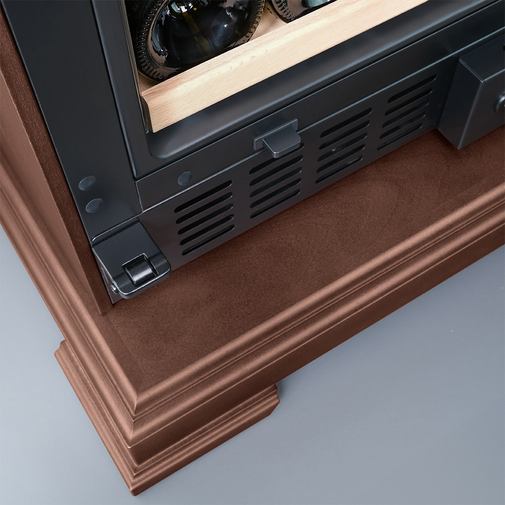 Полки выполнены из массива бука. Этот натуральный и крепкий материал не только имеет красивую текстуру, но и прекрасно гасит небольшую вибрацию. Так что Ваше вино будет храниться в абсолютном покое.
