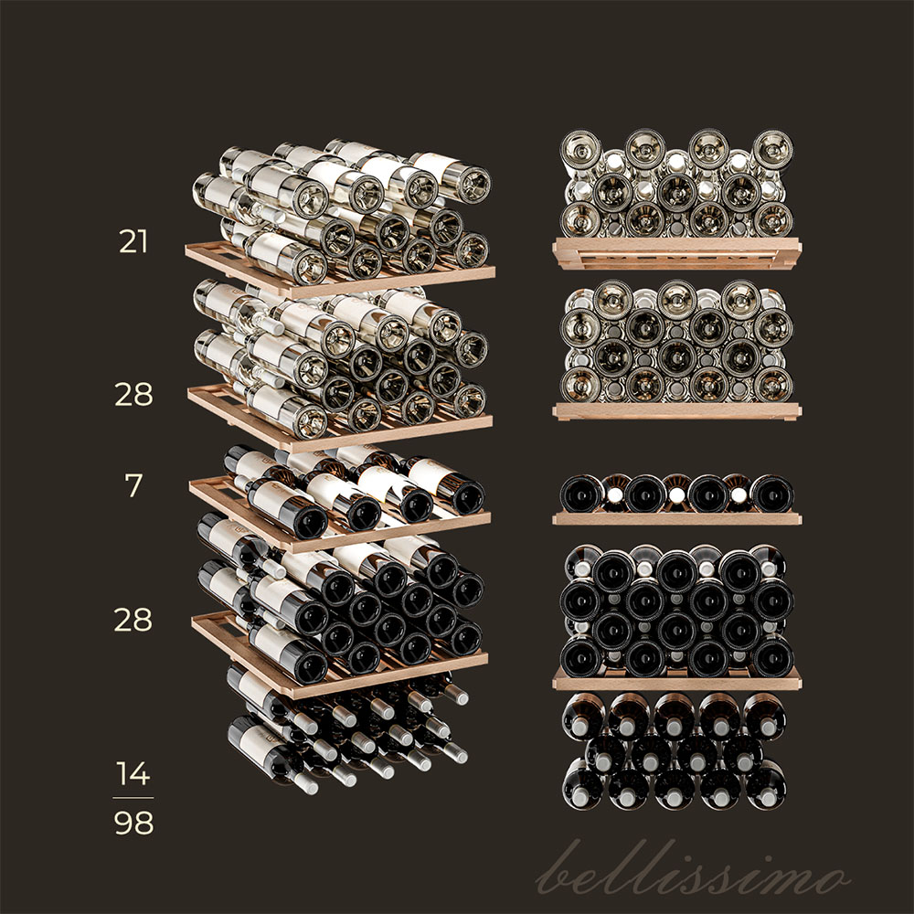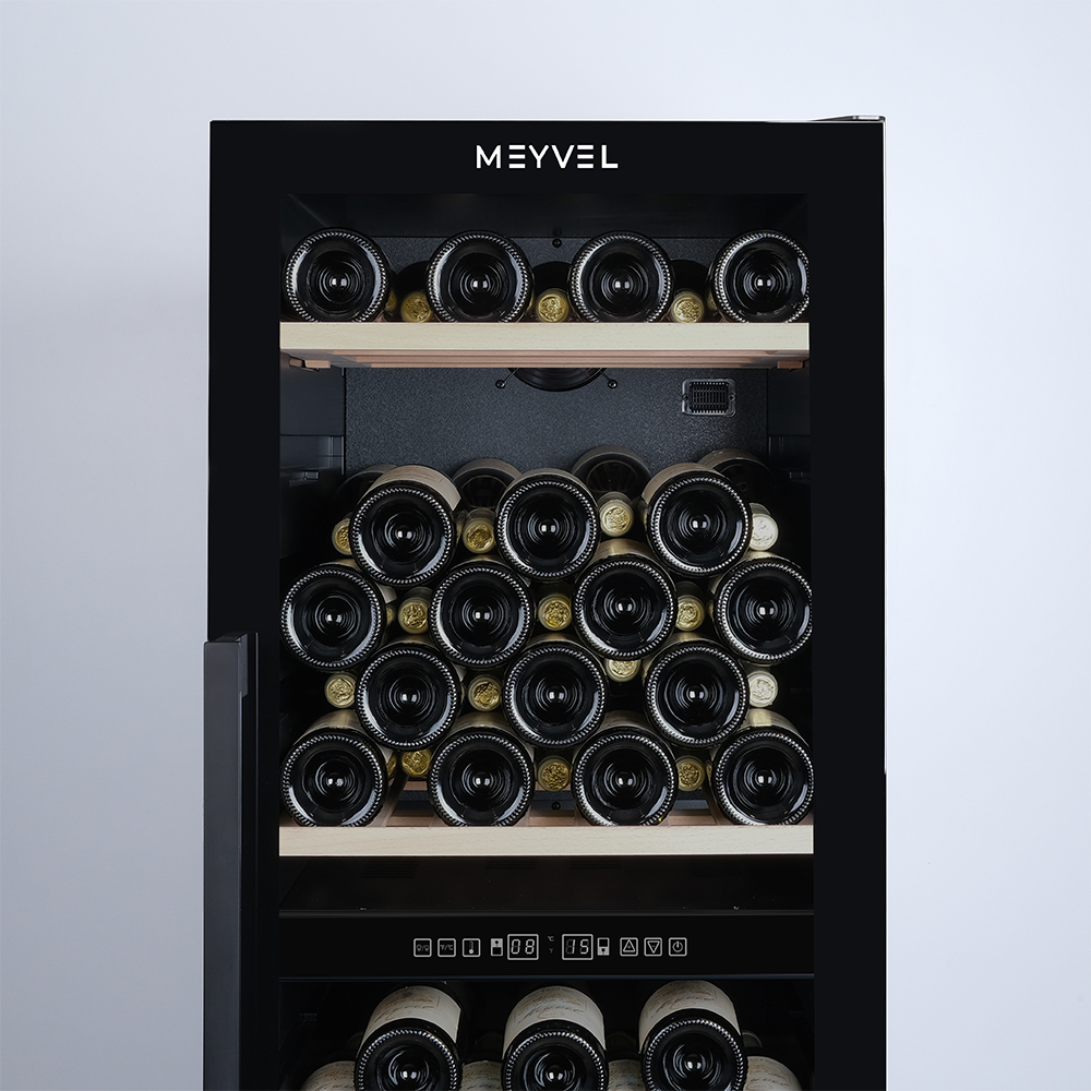Meyvel MV98-KBF2 оборудован двумя температурными зонами, чтобы эффективно хранить различные сорта вин. В верхней зоне температура регулируется в диапазоне от +5 до +12°C, которая идеальна для белых вин и шампанского. Нижняя зона предлагает температурный режим от +12 до +20°C, подходящих для красных вин. Это обеспечивает индивидуальный подход к каждому виду вина. Благодаря большому расстоянию между полками в шкаф помещаются не только бутылки 0,75 л типа «Бордо», но и большего объема. Бутылки также можно установить стоя.